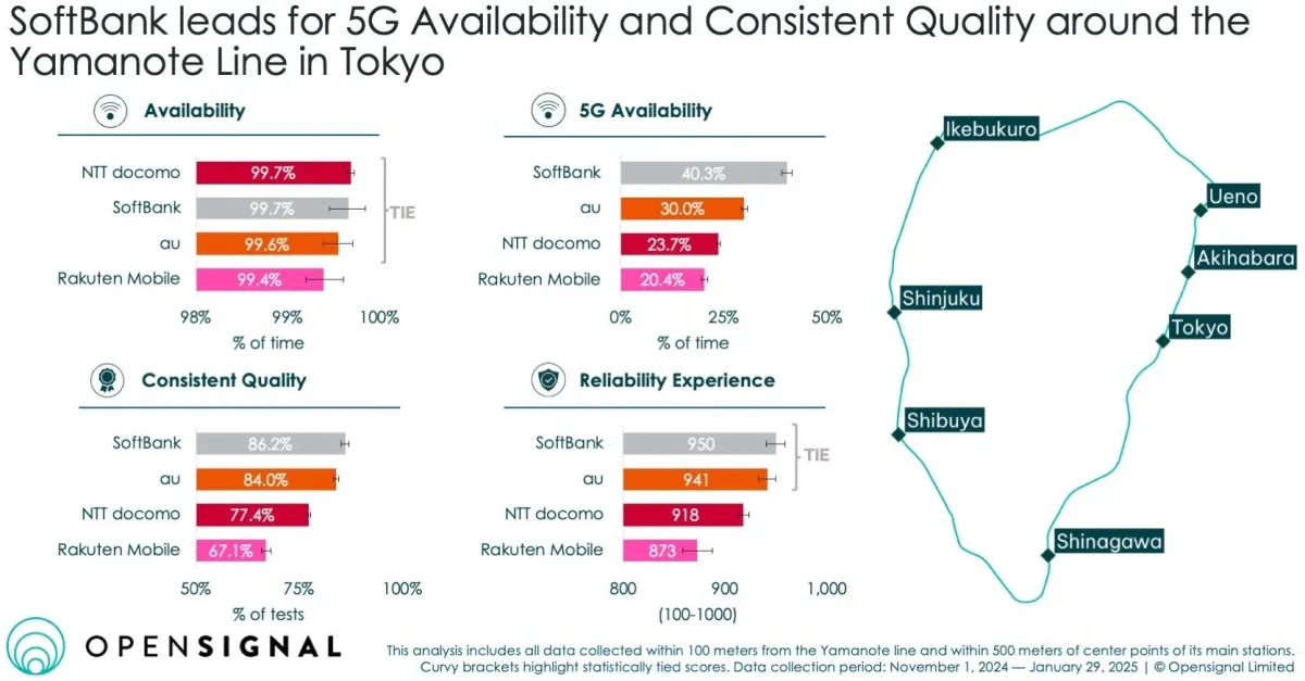 Opensignalによる最新の分析レポートが、山手線周辺のモバイル・ネットワーク・エクスペリエンスを明らかにしました。このレポートは、前回の調査から12か月後に実施されたもので、ネットワークの進化と変化を詳細に探ります。特に注目を集めているのは、ソフトバンクの圧倒的なパフォーマンスです。