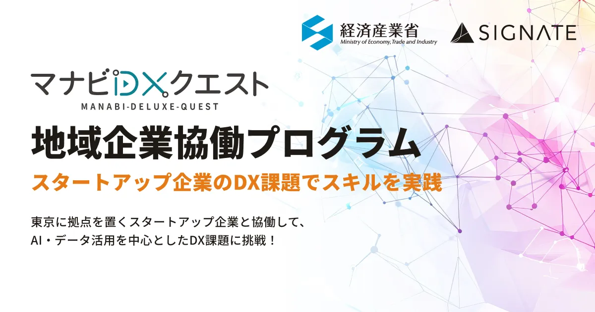株式会社SIGNATE(本社:東京都港区)は、経済産業省の委託によるデジタル人材育成事業「マナビDX Quest」内で、地域企業との協働によるプログラムの成果を発表する報告会を2025年3月4日(火)19:00からオンラインで開催します。今回のイベントは、地域企業やスタートアップにおけるデジタルトランスフォーメーション(DX)への取り組みを支援することを目的としています。