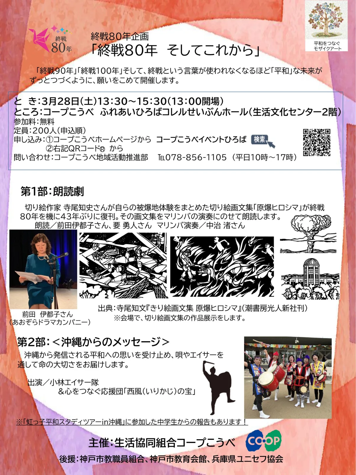 コープこうべは、月に1回のペースで平和関連の映画上映会を開催し、年間7回のプログラムを通じて地域の方々に平和の重要性を再認識してもらう活動を行っています。このたびの朗読劇は、先に行われた寺尾知史さんの切り絵画文集のパネル展示会や朗読会などを主催していた「ヒロシマを語り継ぐ会」の代表・浅海和子さんの協力により実現しました。
