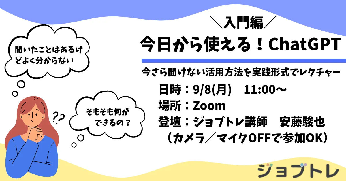 ワークキャリア株式会社が主催する「今日から使える!ChatGPT入門セミナー」が、9月8日(月)11:00から開催されます。このセミナーでは、生成AIであるChatGPTの基本的な使い方を学び、日常生活やビジネスシーンでの活用法を体験することができます。参加は無料で、オンラインでの開催です。