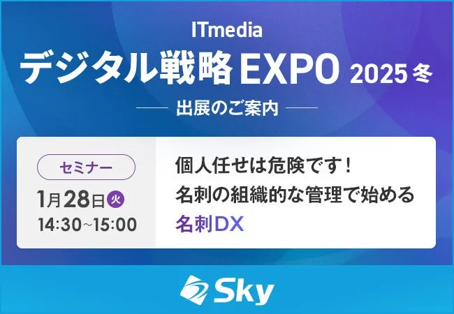 2025年1月28日から2月24日までの間、ITmedia主催のオンライン展示会「ITmedia デジタル戦略EXPO 2025 冬」にSky株式会社が出展します。この展示会では、最新の自社開発商品の紹介とともに、特別セミナーも予定されています。