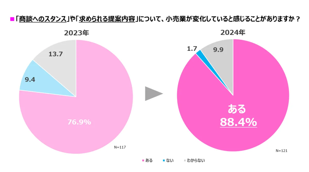 全体の88.4%が「小売業の商談スタンスに変化がある」と回答。昨年に比べて11.5ポイントの上昇が見られ、商談スタンスや求められる提案内容に変化があることを感じているとのことです。