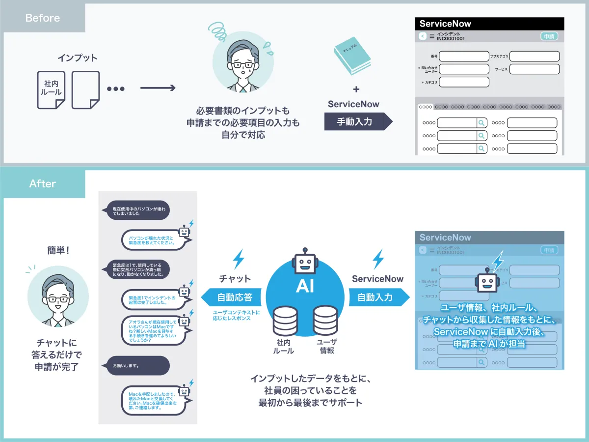 従来の業務プロセスでは、メールやExcelによる手作業が主流でした。しかし、ServiceNowなどのローコードソリューションの普及に伴い、企業はデジタル化の波に乗り、業務の効率化を図るようになりました。ところが、これに伴ってシステムへの入力作業が増加し、従業員は複雑な操作マニュアルに依存せざるを得ない状況が生まれています。このような環境では、特別な技能が必要とされ、ITに対するイメージが悪化する要因ともなりかねません。