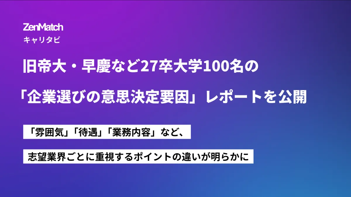 株式会社ZenXが運営するキャリア支援サービス「ZenMatch」と、キャリア支援コミュニティ「キャリタビ」が共同で、2027年卒業予定の大学生を対象にした「企業選びの意思決定要因レポート」を発表しました。この140ページにわたるレポートでは、旧帝大や早慶といった偏差値の高い大学に在籍する学生100名を対象に、企業選びで何を重視しているのか、具体的な傾向が探られています。
