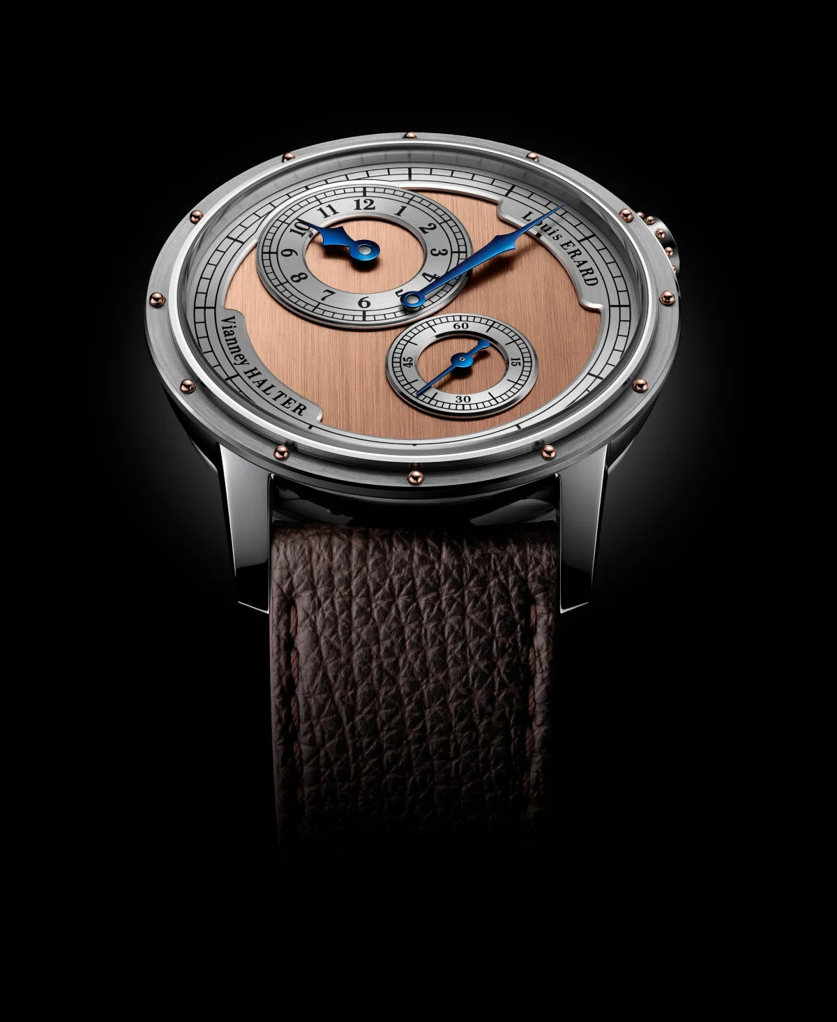 リューズは、ヴィアネイ・ハルターのシグネチャーデザインが施され、また24個の5Nゴールドリベットがついており、時計の高級感を一層引き立てています。裏蓋には、「Louis Erard x Vianney Halter Limited Edition 1 of 178」とのエングレービングが施されており、限定品としての特別感を感じさせます。