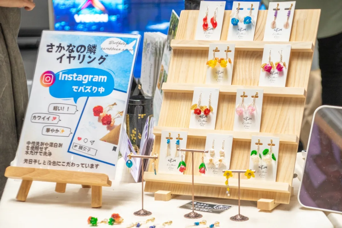 出展ブースでは、主力商品である「痛くならないイヤリング」を中心にした鱗のアクセサリーが並べられました。魚の鱗を使用したこのアクセサリーは、一つひとつ手作りで、作り手の思いが込められています。そのため、多くの来場者から高い評価を受けました。