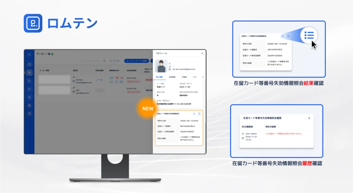 最近、「ロムテン」に新たな機能が追加され、在留カード番号の失効情報をリアルタイムで確認できるようになりました。この機能は、出入国在留管理庁が提供する失効情報照会サイトに問い合わせを行い、その結果を管理画面で確認できるものです。これにより、在留資格の変更や更新を行っている外国人従業員の情報を迅速に把握することが可能になります。