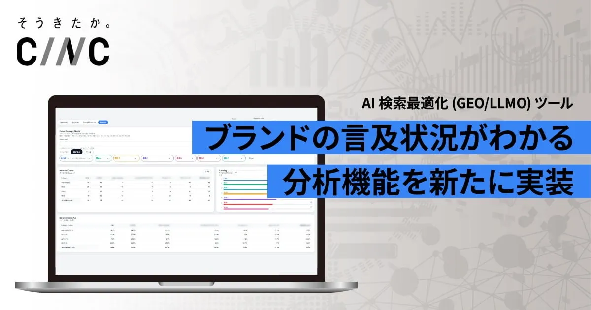 株式会社CINC(本社:東京都港区、石松友典代表)が、同社の開発したAI検索最適化(GEO/LLMO)ツールに新機能を搭載しました。このアップデートは、引用ドメインやブランドの言及数を視覚的に分析することができ、業務の効率化を目指しています。