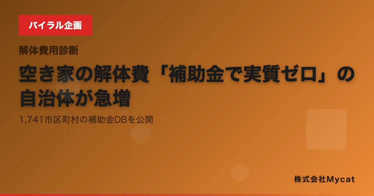 株式会社Mycatは、全国1,741の市区町村における空き家解体補助金の情報を網羅した「解体補助金データベース」を公開しました。このデータベースでは、居住地を入力すれば、その地域で利用可能な補助金制度が即座に検索できる仕組みが整っています。