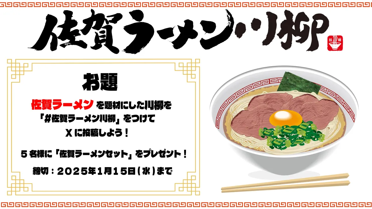 さて、多くの方が年末や成人式の帰省を楽しみにしているこのシーズン、佐賀ラーメンをぜひ食べる機会を作ってみてください。それに合わせて、佐賀市では「佐賀ラーメン川柳 投稿キャンペーン」が開催されます。このキャンペーンでは、参加者が自身の佐賀ラーメン愛を5・7・5の川柳として表現し、ハッシュタグ「#佐賀ラーメン川柳」をつけてX(旧Twitter)に投稿することが求められます。