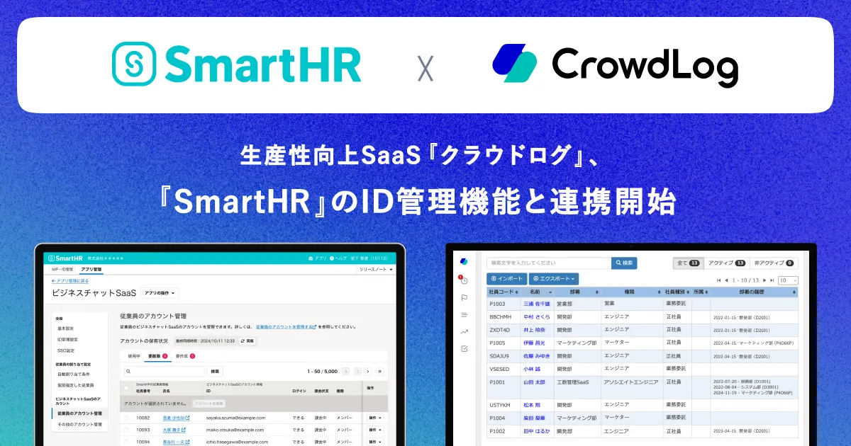 株式会社クラウドワークス(以下、クラウドワークス)が提供する生産性向上SaaS『クラウドログ』が、株式会社SmartHR(以下、SmartHR)との協業を開始しました。この連携は、クラウドワークスの『クラウドログ』とSmartHRのID管理機能が融合することで、企業の働き方を可視化し、より効率的な業務運営を実現することを目指しています。