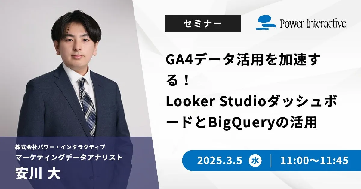 株式会社パワー・インタラクティブでは、2025年3月5日(水)の11:00から11:45までの間、オンラインで無料ウェビナー「GA4データ活用を加速する!Looker StudioダッシュボードとBigQueryの活用」を開催します。このウェビナーでは、Googleアナリティクス4(GA4)のデータ分析に関する悩みや課題を解決するための情報が提供されます。