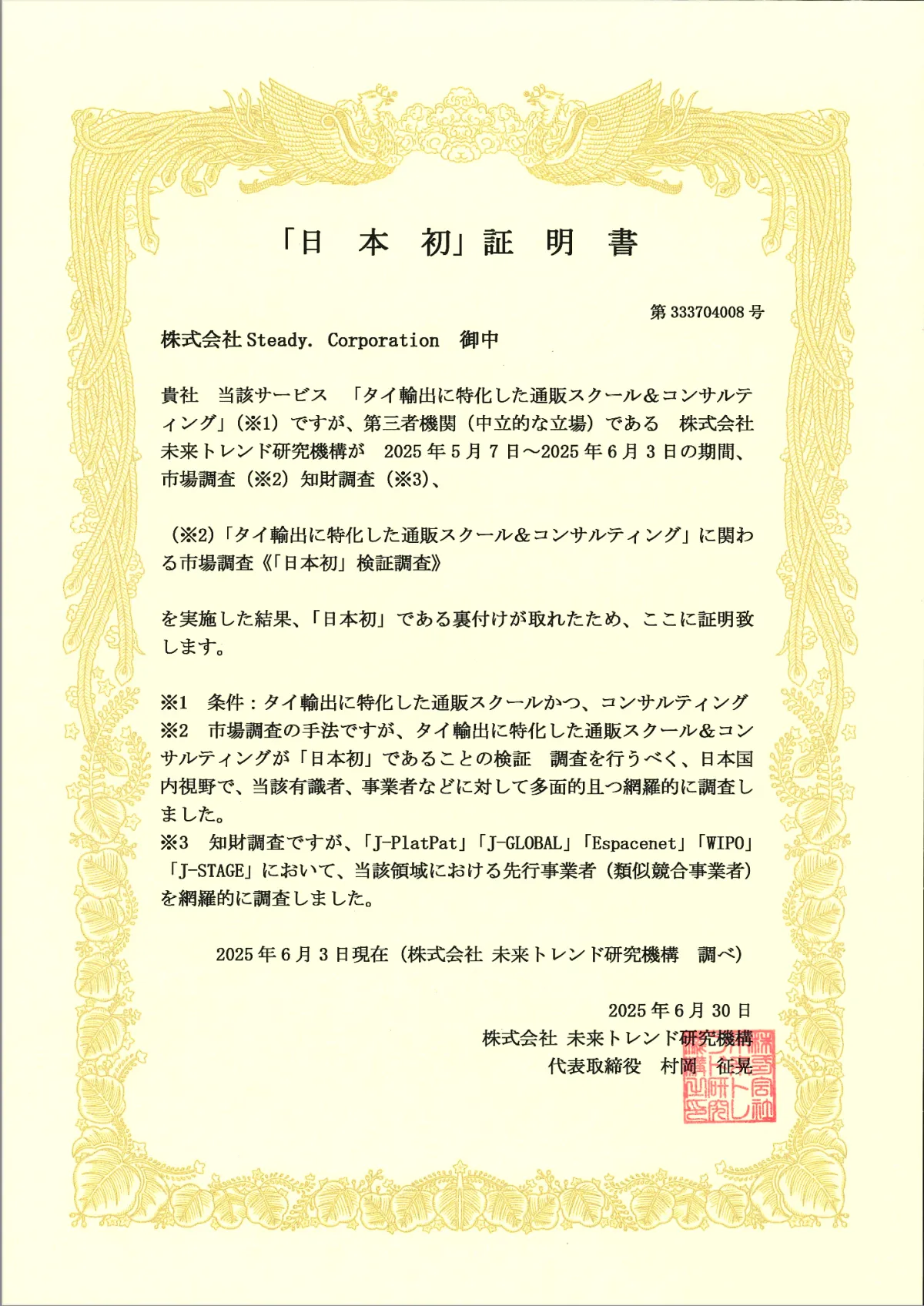 2025年7月3日、日本のビジネスシーンにおいて注目される動きがありました。株式会社Steady. Corporationとタイ貿易のスペシャリスト篠崎大輔氏が共同で展開する『円安×AI』式タイ輸出通販プロジェクトが、株式会社未来トレンド研究機構による調査で「日本初」かつ「業界No.1」の称号を獲得しました。本記事では、このプロジェクトの背景や独自の特徴、今後の展望について詳しく解説します。