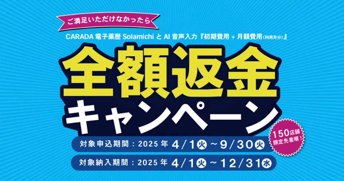 株式会社ソラミチシステムが提供するクラウド型電子薬歴『CARADA 電子薬歴 Solamichi』は、2025年4月1日より新規導入キャンペーンを開始しました。このキャンペーンでは、先着150店舗へ特典が提供され、初期費用と月額費用の全額返金が保証されています。これにより、薬局が新たなテクノロジーを試すきっかけとなります。