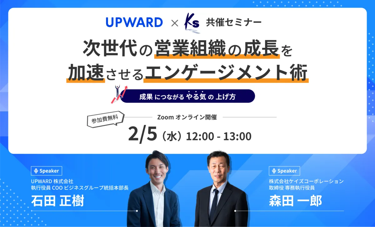 2025年2月5日(水)12:00、UPWARD株式会社が主催する無料オンラインセミナー「次世代の営業組織の成長を加速させるエンゲージメント術〜成果につながるやる気の上げ方〜」が開催される。このセミナーは、営業現場が直面する課題を解決するための具体的な取り組みを学ぶ貴重な機会である。
