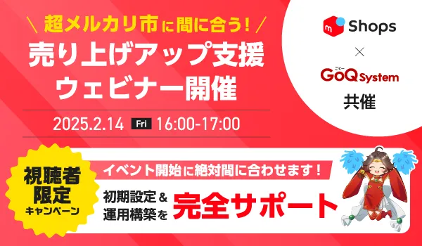 株式会社GoQSystem(東京都中央区)は、急成長を遂げる「メルカリShops」に焦点を当てたオンラインセミナー『超メルカリ市に間に合う!売上アップ支援ウェビナー』を2025年2月14日(金)に開催します。このセミナーは、オンラインで開催され、自宅やオフィスから参加しやすいのが特徴です。メルカリの販売強化を模索している方には特におすすめです。
