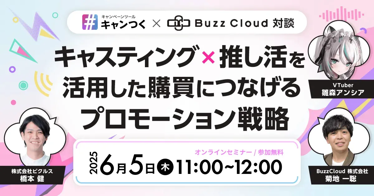 2025年6月5日(木)11時、BuzzCloud株式会社と株式会社ピクルスが共催するウェビナー「Vtuber雛森アンシアさん登壇!キャスティング×推し活を活用した購買につなげるプロモーション戦略」が開催されます。このウェビナーでは、SNSキャンペーンツール「キャンつく」とキャスティングを手掛けるBuzzCloudが連携し、ファンの熱意を購買意欲に変える方法を紹介します。