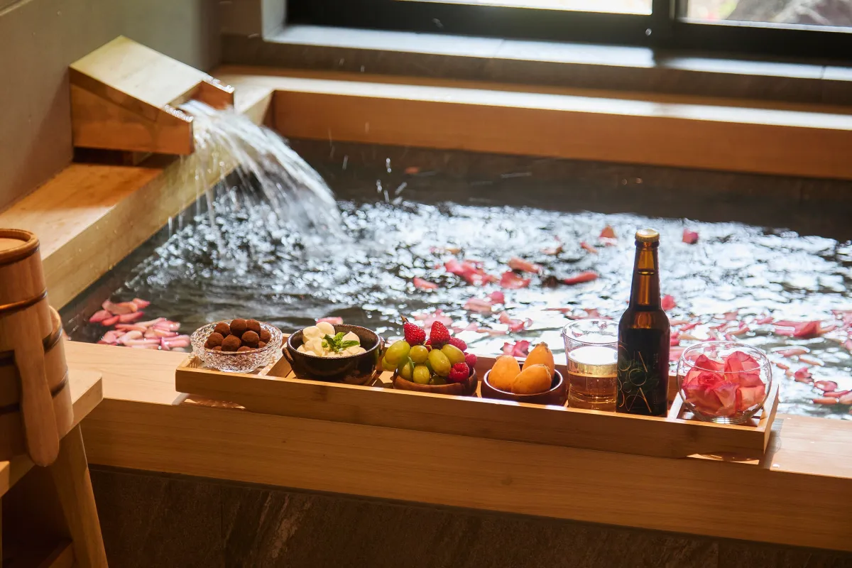 プライベート温泉での特別なバスタイムを楽しめるこのサービスは、フルーツベリーやチーズ、クラフトチョコレートなどを五感で堪能することができます。また、リラックスできるアロマ関連商品もオプションとして販売。1セット6,000円(税込)で提供されます。