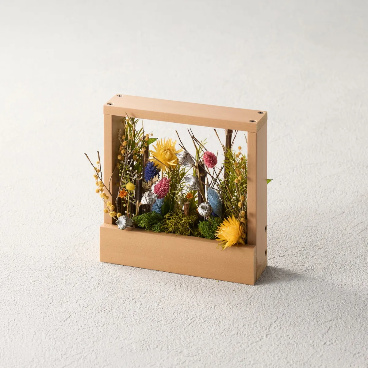 箱庭「まど花」は、まるで小さな窓から美しい花々が広がる景色を眺めているかのようなデザインが特徴です。永遠に色あせないドライフラワーが束ねられたこの花箱は、自然の美しさをそのまま閉じ込めたまさに小さな庭。暮らしの空間に優しく溶け込み、花の温もりを感じさせてくれます。