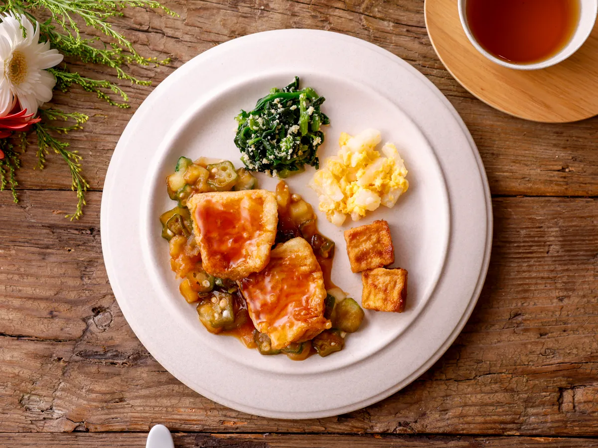 「黄金かれいのさっぱり旨だしあん」は、しっとりとした食感の黄金かれいをメインに、あっさりとした旨だしあんがかけられています。このあんには、だしの旨味とわずかなレモンの香りが特徴で、軽やかさと十分な満足感を兼ね備えています。また、オクラやじゃがいもなどの添え野菜との組み合わせにより、食感のバリエーションも楽しむことができます。副菜には、高野豆腐を使った菜の花のそぼろ和えや、シャキシャキとした食感のやまいもを使った卵サラダ、絹揚げのおろしだれが添えられ、バランス良く仕上がっています。