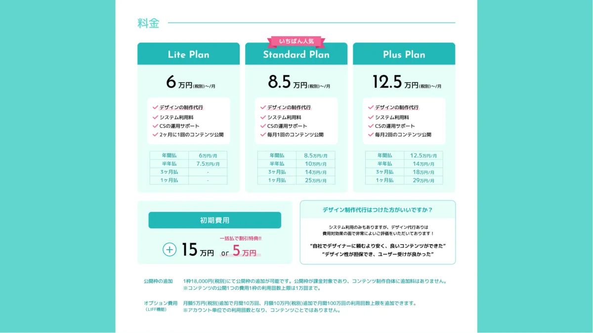 - デザイン制作代行、システム利用料、カスタマーサポートが含まれ、2ヶ月に1回のコンテンツ公開が可能。