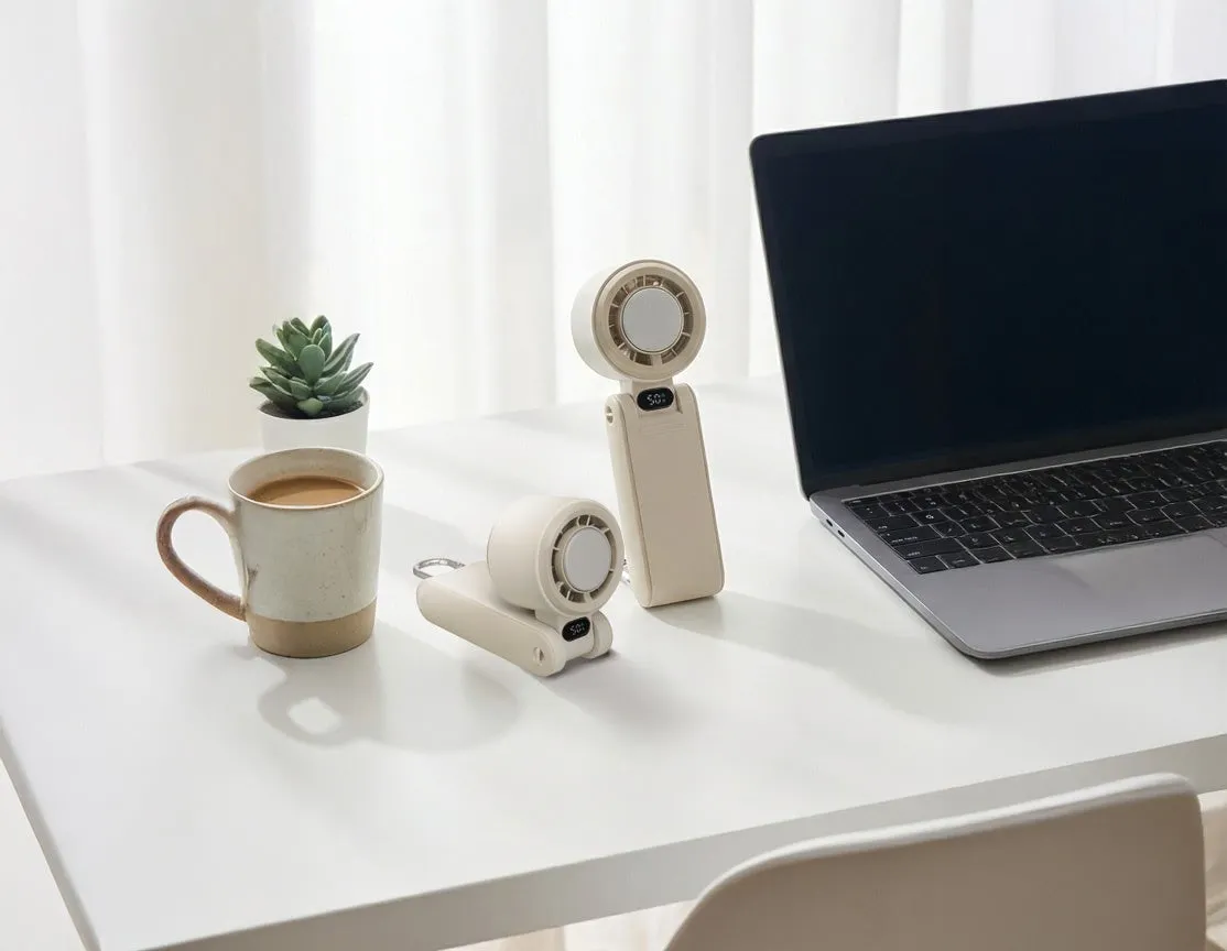 このハンディファンの最大の魅力は、その多機能性です。ハンディファン、首かけファン、卓上ファンの3つの使い方を提供し、場所やシーンに合わせて手軽にスタイルを変更することができます。特に、首かけスタイルでは両手を自由に使えるため、アウトドアや仕事中の使用に最適です。卓上に置く際も角度調整が可能で、希望する風を当てることができます。