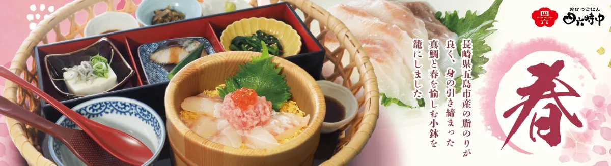 「春爛漫花籠」では、長崎県五島市産の真鯛を主役に、おひつごはんが仕立てられています。ここに、しらすや菜の花、鰆といった春ならではの食材を組み合わせた3種類の小鉢も添えられており、目にも美しい一皿です。