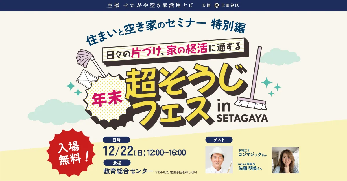 2024年12月22日、世田谷区で行われる「年末超そうじフェス in SETAGAYA」。このイベントは、住まいや空き家の問題を解決するためのセミナーイベントで、家族全員が楽しめるプログラムが盛りだくさんです!参加費は無料で、予約制で先着150名限定とのことです。