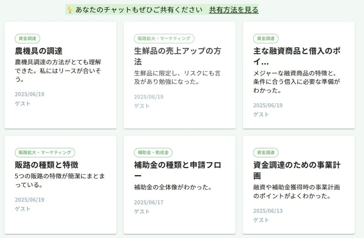 新規就農に関する様々な質問に24時間体制で応えるAI機能があり、農業経営に必要な情報を容易に取得できます。このAIは他の農業者の質問を閲覧することができ、自分の経営課題を認識するための手がかりともなります。