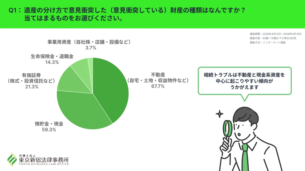 相続は誰にとっても避けて通れないテーマですが、実際に遺産を分割する際には意見が割れることが少なくありません。特に、弁護士法人 東京新宿法律事務所が実施した調査によれば、45歳以上の相続人を対象にした結果、不動産や預貯金が意見衝突の原因となりやすいことが明らかになりました。