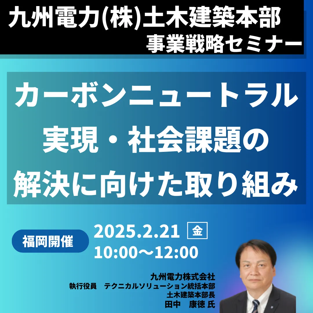 2025年2月21日(金)に、九州電力株式会社の田中康徳氏を講師に迎え、福岡で「カーボンニュートラル実現・社会課題の解決に向けた取り組み」のセミナーが開催されます。このセミナーは、持続可能な社会を目指す九州電力の具体的な取り組みや、企業としての役割について詳しく学べる貴重な機会です。
