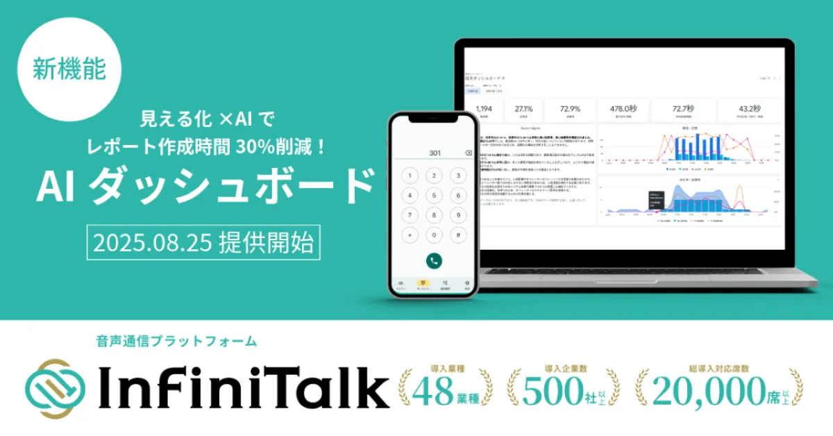 音声通信プラットフォーム「InfiniTalk」から、新たな機能「AIダッシュボード」が発表されました。この新機能は、コールセンターにおける迅速で効果的な意思決定をサポートするために開発され、2025年8月25日から提供が開始されます。