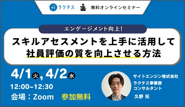 企業の人事部門や教育担当者にとって、社員のスキルやパフォーマンスを正確に評価することは非常に重要です。そのためには、スキルアセスメントを効果的に活用することが求められます。サイトエンジン株式会社が提供するスキルチェックツール「ラクテス」では、社員評価の質を向上させるための無料セミナーを開催します。このセミナーは、2025年4月1日と4月2日の2日間にわたり、それぞれ12:00から30分間、オンラインで行われます。