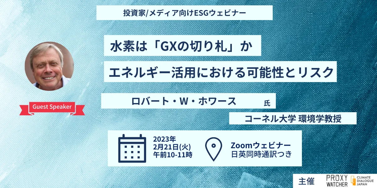 2023年2月21日(火)に、株式会社Proxy Watcherと一般社団法人クライメート・ダイアログによるオンラインウェビナーが開催されます。このウェビナーでは、ロバート・W・ホワース氏(コーネル大学環境学教授)をゲスト講師に迎え、水素エネルギーの基礎理論とその環境への影響について講演が行われます。本イベントは、日本のGX戦略やエネルギー移行に関心のある方々に最適な機会です。