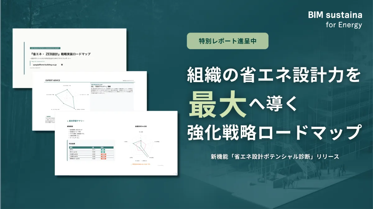 「BIM sustaina for Energy」は単なる計算ツールではなく、設計者の創造性を引き出す伴走者としての役割を果たします。この「省エネ設計ポテンシャル診断」を基に、自社の設計力を可視化し、新たな価値を見いだす第一歩を踏み出してみてはいかがでしょうか。性能基準がますます強化される時代だからこそ、「選ばれる設計事務所」として進化を続けるために、最初の一歩を踏み出すことが重要です。