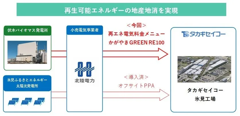 タカギセイコーに供給される電力は、東京ガスグループの伏木バイオマス発電合同会社が運営する伏木バイオマス発電所の環境価値を基にしています。北陸電力が提供するこの電力は、実質的にCO2排出量がゼロであり、環境に優しい選択肢となります。タカギセイコー氷見工場は、すでに2025年3月からは氷見ふるさとエネルギーが運営する太陽光発電所からの電力を利用し、オフサイトPPAで調達した電力を融合させています。この時点で、タカギセイコーは再生可能エネルギー100%の実現を達成しています。