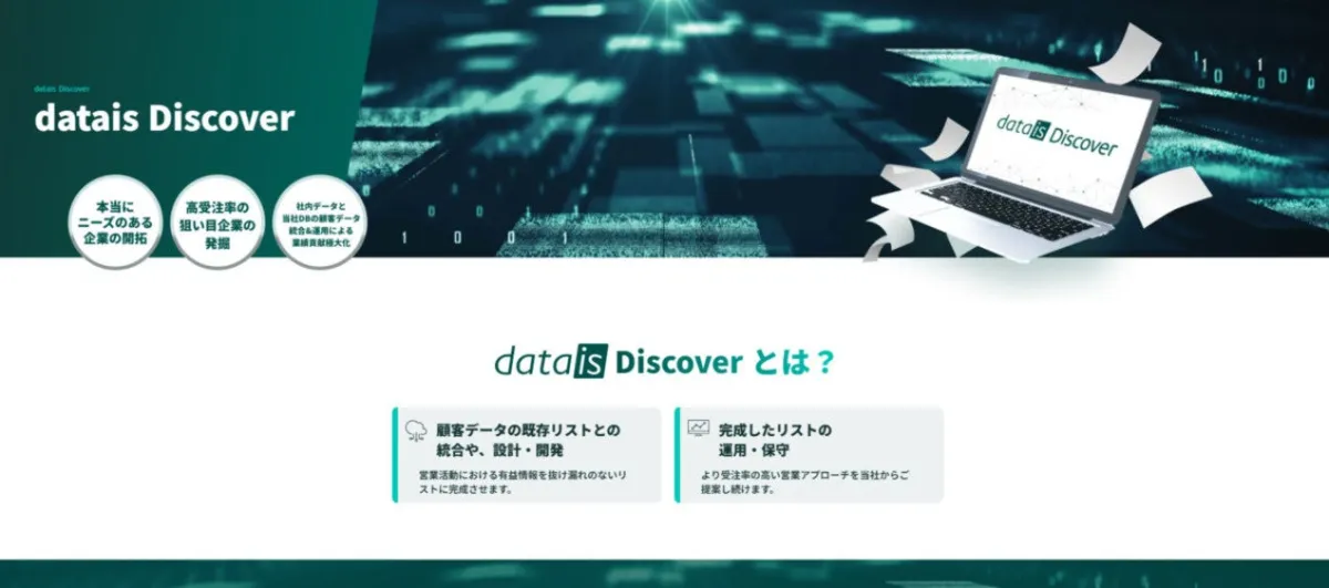 datais Discoverは、自社保有データの整備や外部データの補填を通じて、ビジネスの最大化に貢献するサービスです。必要なデータが常に最新の状態に保たれ、営業プロセスの効率化を図ることができます。データ活用の可能性を探求する企業にとって、datais Discoverは理想的なツールと言えるでしょう。