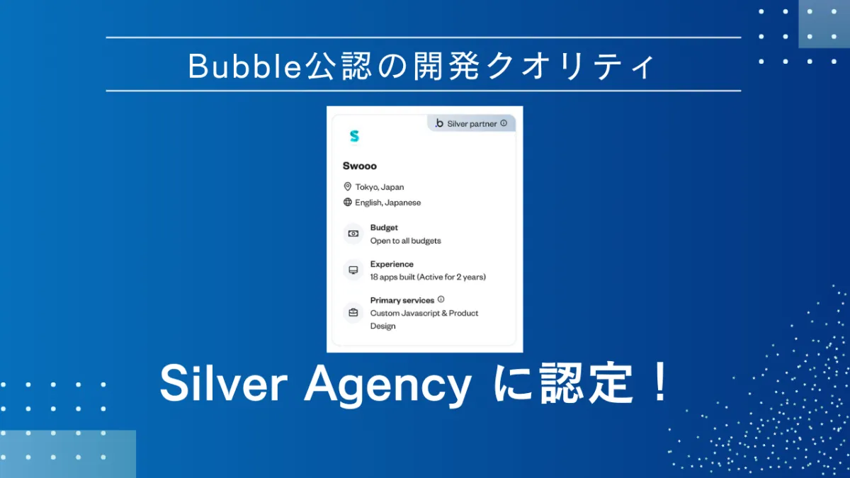 ノーコード開発サービス「Swooo」が、ノーコード開発プラットフォームのBubble社から正式に認定を受け、業界の注目を集めています。この認定は「Silver Agency」と呼ばれ、現時点で日本国内では顔を合わせることの少ない唯一無二の資格のひとつです。