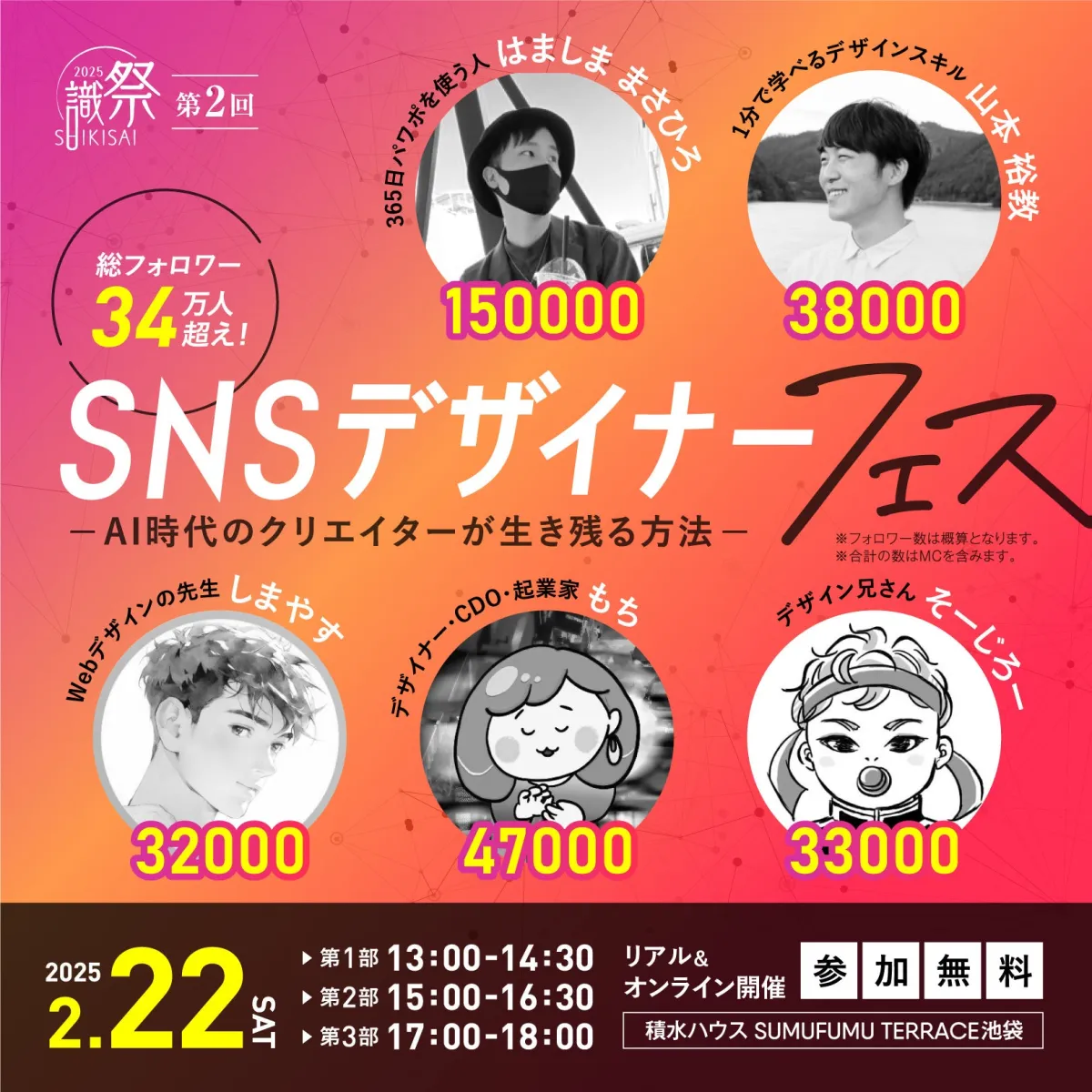 SNSで活躍するデザイナーたちが一堂に会するイベント「SNSデザイナーフェス」が、2024年2月22日に積水ハウスSUMUFUMU TERRACE池袋で開催されます。このイベントでは、インフルエンサーとして注目を集めるデザイナー5名が集まり、現代のデザイン業界のトレンドや自らのブランディングの方法、生成AIの活用法などについて語ります。