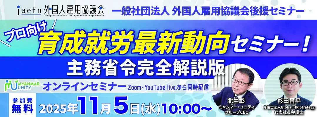 今回のセミナーでは、育成就労制度の主務省令が詳しく解説される予定です。監理支援機関や育成就労制度を利用した人材確保を考える企業様にとって、有用な情報が詰まっています。講師には、ミャンマーの圧倒的No.1人材送り出し機関である「ミャンマー・ユニティ」の北中彰氏と、弁護士法人Global HR Strategyの杉田昌平氏が登壇。お二人の専門的な視点から、育成就労制度の実施に必要な情報が提供されます。