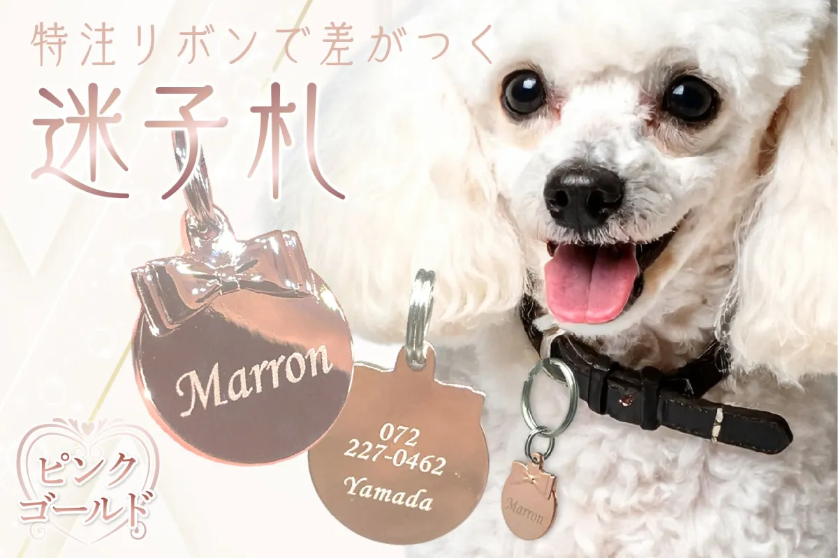 リボン型の迷子札は、他では手に入らない個性的なデザインが特徴です。丸いフォルムにリボンがあしらわれており、可愛らしさが際立つ一品。デザインの優雅さは、愛らしいペットにぴったりマッチし、「うちの子らしさ」を強調します。これまでの迷子札とは一線を画し、特別な存在感を持つ迷子札となることでしょう。