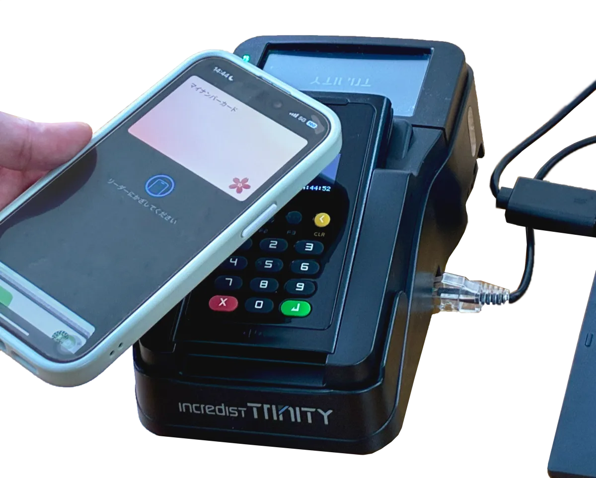 myVerifist医療エディションの最大の特徴は、保険証の読み取りとキャッシュレス決済を同一端末で行えることです。具体的には、保険証の読み取り機能とキャッシュレス決済機能を兼ね備えた「Incredist Trinity」という端末を使用。これをオンライン資格確認用のWindows PCに接続することで、マイナンバーカードを用いた健康保険証の読み取りとオンライン資格確認が行えます。