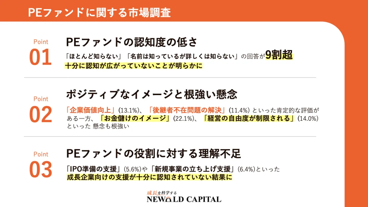 この調査から、PEファンドに対する理解の低さや情報収集における課題が浮き彫りになりました。また、PEファンドに関連するポジティブな評価とネガティブな印象が同時に存在することもわかりました。特に後継者問題解決のための重要な選択肢として認識はされつつも、その具体的な支援内容については周知が不足しています。これを受けて、NEWOLD CAPITALは「PEファンドの窓口」を設立し、正確な情報提供と活用支援に務めていく方針です。
