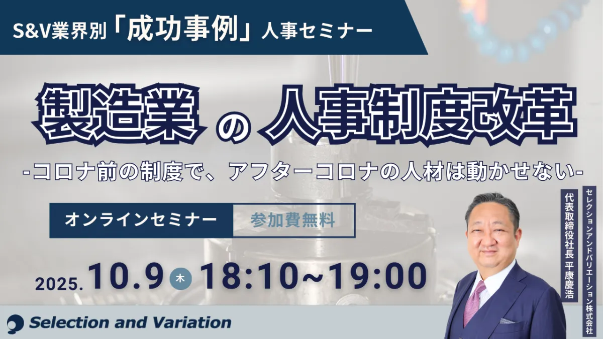 2025年の10月、セレクションアンドバリエーション株式会社がオンラインで開催する「人事制度改革セミナー」。昨今のコロナ禍を経て、変化を遂げつつある製造業の現場において、人事制度の見直しが急務となっています。特に、変わりつつある働き方に適応するためには、従来の「我慢型」制度から脱却し、「挑戦型」制度への改革が必要です。