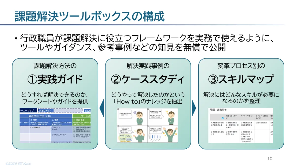 - - 実践ガイド:課題解決のフレームワークやワークシートを提供。
