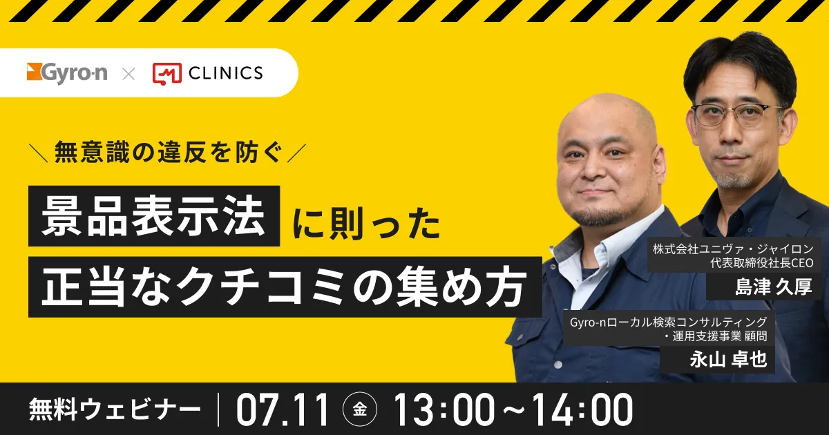 東京都港区に本社を置く株式会社ユニヴァ・ジャイロンが、株式会社メドレーとの共同で無料ウェビナーを開催します。本ウェビナーのテーマは「無意識の違反を防ぐ / 景品表示法に則った正当なクチコミの集め方」。2025年7月11日(金)13:00からスタート予定で、クリニックのスタッフや経営者にとって非常に有益な内容が盛り込まれています。