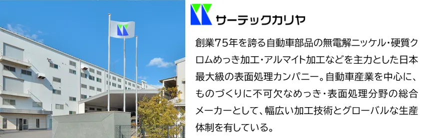 サーテックカリヤは、愛知県刈谷市に本社を構える、金属表面処理技術のリーディングカンパニーです。近年、自動車部品の高機能化が求められる中で、同社は耐熱や耐摩耗の機能を付加する多数の実績を持っています。創業から75年の歴史を経て、同社は安定した顧客基盤を持ち、特に自動車業界においてその存在感を強めています。