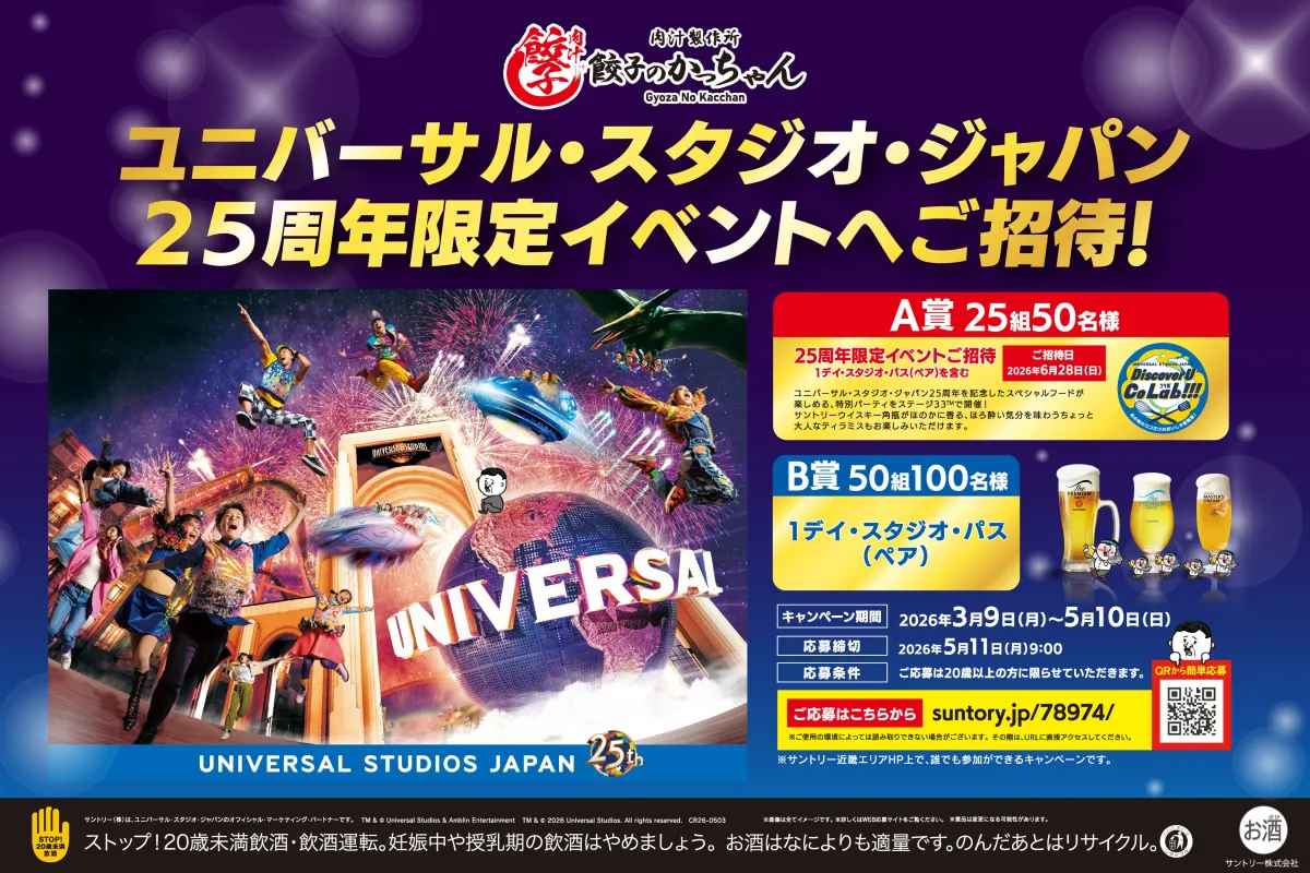 居酒屋「肉汁製作所 餃子のかっちゃん」が、2026年3月9日から関西エリアの16店舗で特別なキャンペーンを実施します。このキャンペーンは、ユニバーサル・スタジオ・ジャパン(USJ)の開業25周年を祝うもので、他では味わえない特典が盛りだくさん。餃子の美味しさとエンタメ体験を一度に楽しめる素晴らしい機会です。