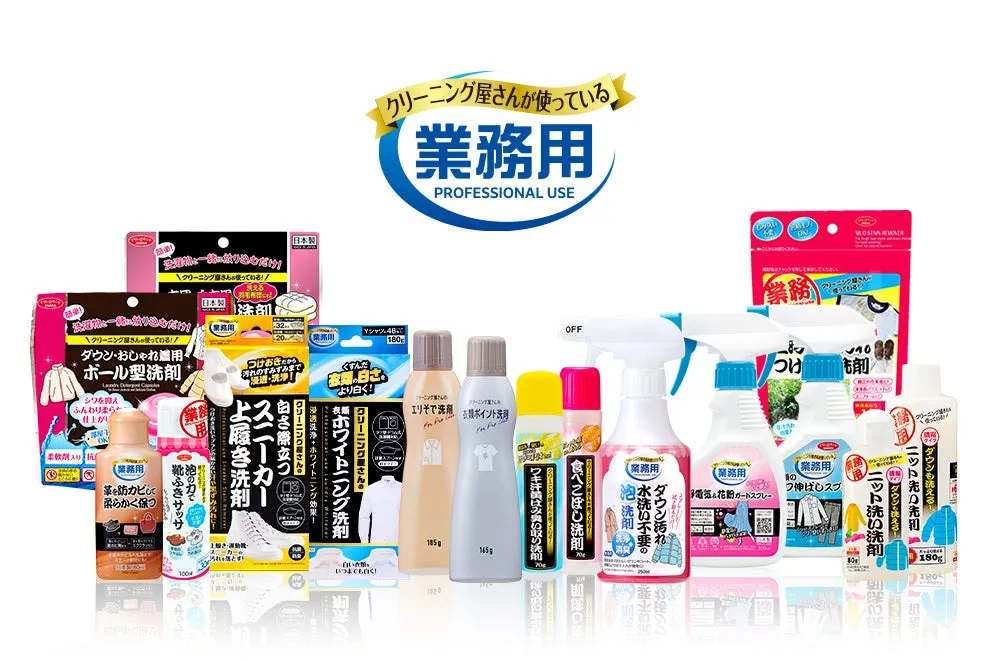 このシリーズで最も人気のある製品が「クリーニング屋さんのエリそで洗剤」です。プロの洗浄力を忠実に再現したこの商品は、長年の間愛され続けています。現在では3代目となり、使用者のニーズに合わせて改良が重ねられています。簡単に「塗って洗う」だけで、家庭では対処が難しいエリそでの脂汚れを確実に落とします。