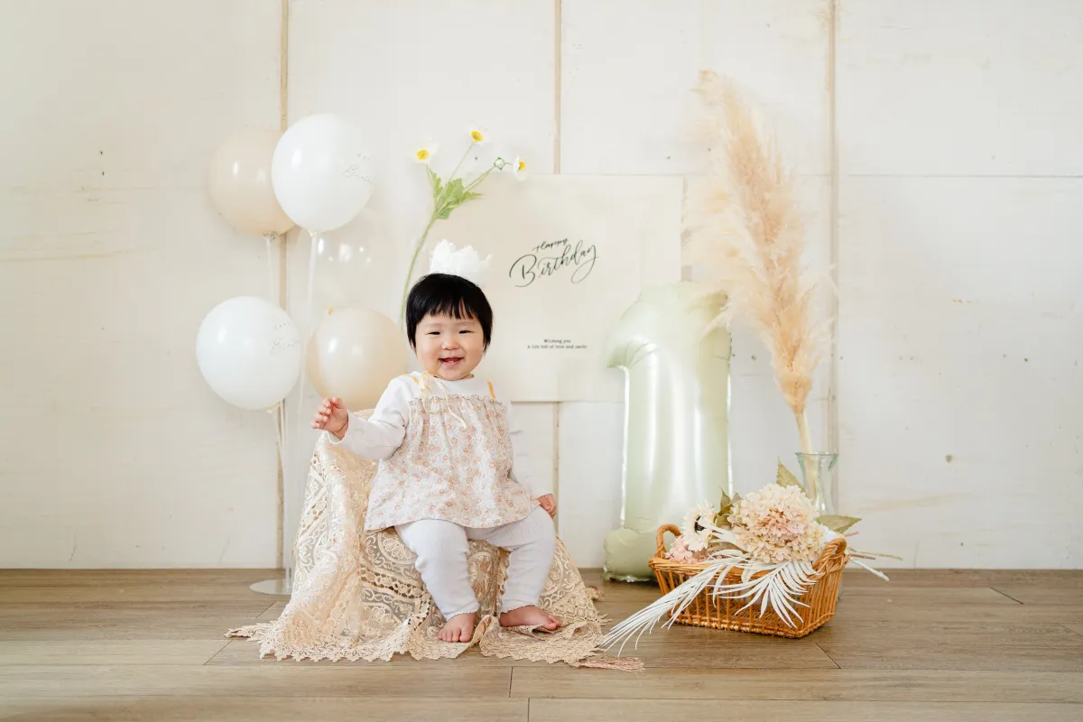 撮影: 自宅でお子さまの誕生日の記念日を思い出深いものにするために、家族みんなでリラックスして撮影を楽しみます。